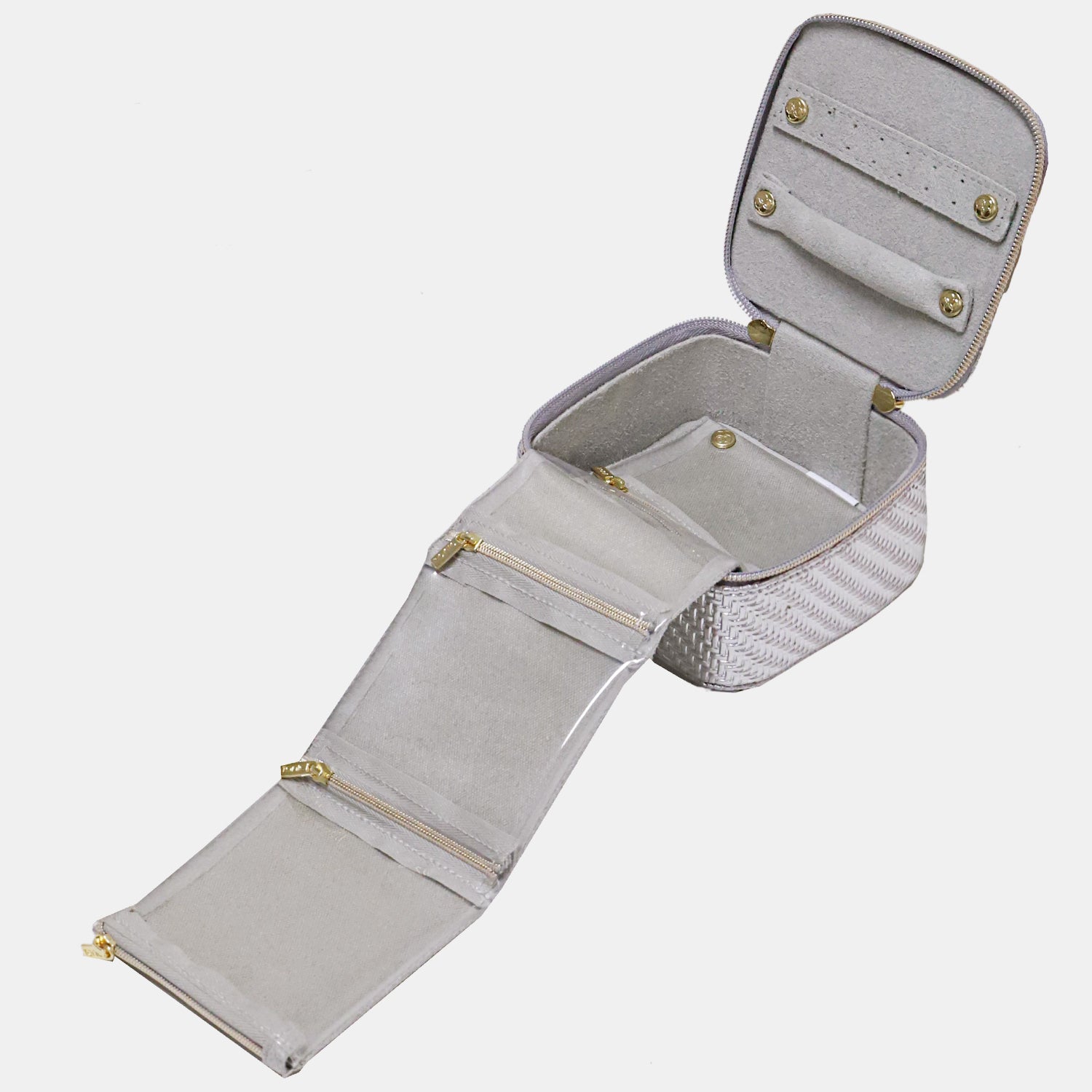 Finished with elegant double gold zips that open to reveal the trademarked accordion pocket design, the clear windows ensure you can always see your favourite items while the zip closures keep them secure and tangle free. Dedicated holders for earrings and rings make packing for travel effortless.